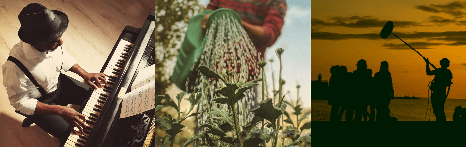 [Image description: The banner image at the top of the page is a graphic that features three images. The left-most image is an aerial photograph of a Black man playing piano, wearing a black hat, white button down shirt, and black dress pants and suspenders. In the foreground of the middle photograph is a leafy plant that is being watered by a Black man holding a bright green watering can, in the background is greenery and a blue sky. The right-most image is a silhouetted photograph of a film crew on the waterfront at sunset: one crew member holds a boom mic above the heads of a group of actors.]